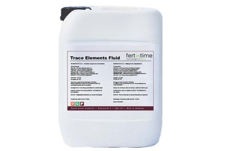 In Time Trace Elements Fluid bevat 6 gechelateerde sporenelementen: B / Mo / Cu / Fe / Zn / Mn. die onder deze organische vorm opneembaar zijn via de bladmondjes.