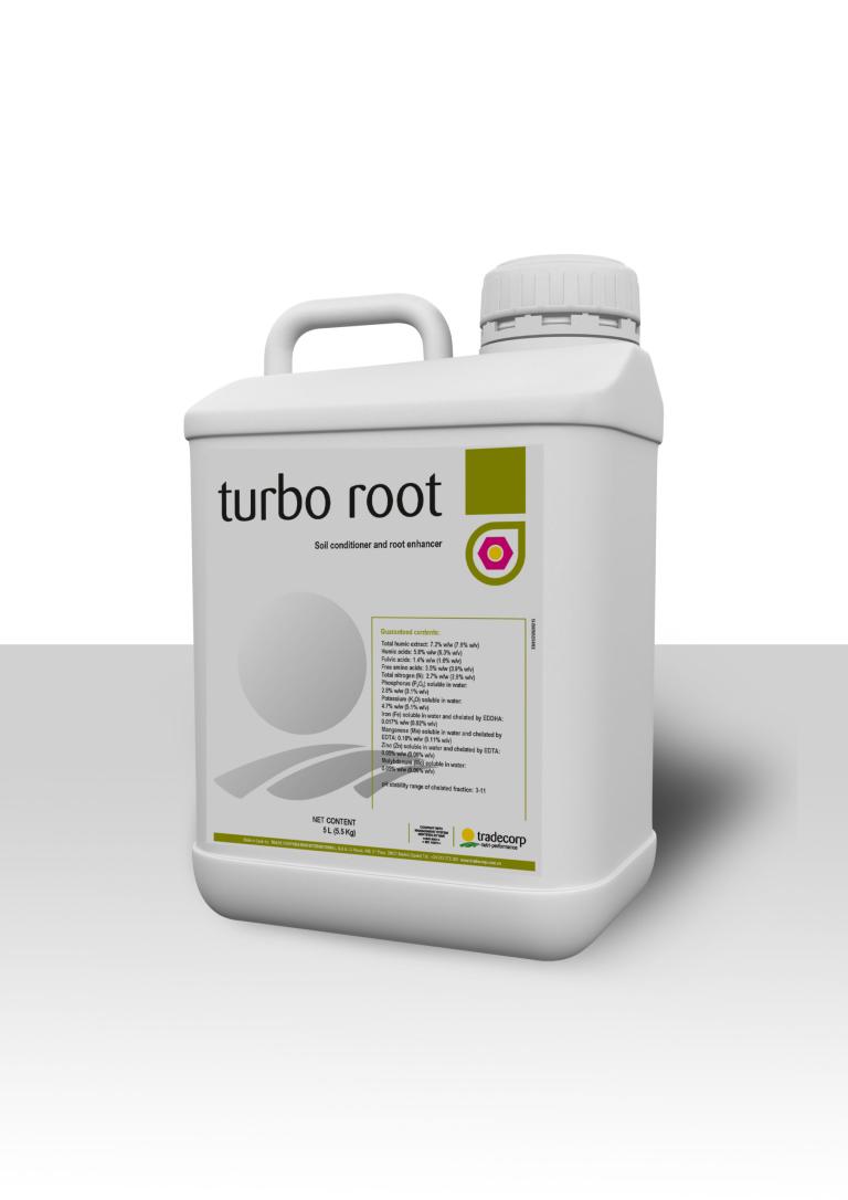 Het is een combinatie van de gekende Humifirst met Ruter AA. De oplossing bevat een lage concentratie aan NPK maar wordt ook aangevuld met sporenelementen Fe, Mn, Zn en Mo. Turbo Root verbetert de bodemstructuur en zorgt voor een betere waterretentie. Het verbetert de wortelontwikkeling en zorgt ook voor een optimale assimilatie en beschikbaarheid van voedingsstoffen. Toepassing in het voorjaar via de bodem.